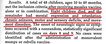 1998’de Pediatrics Dergisinde, CDC yazarları tarafından, incelemeye alınan kızamık aşılaması yapılmış çocukların öldüğü veya kalıcı beyin hasarına, motor ve duyusal eksikliklere, zihinsel gerileme ve yavaşlamaya ve felce uğradığı zaten bildirilmiştir! [Kaynak: (17)]