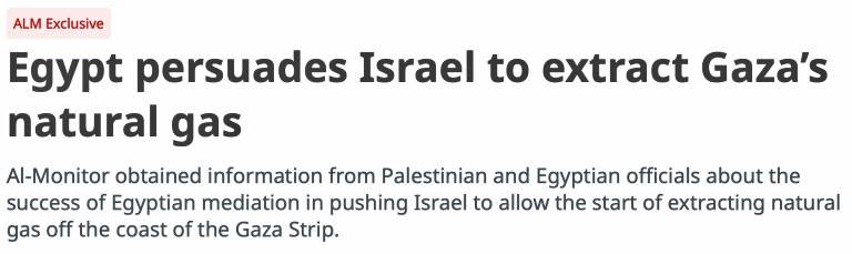 İsminin açıklanmaması kaydıyla Al-Monitor’a konuşan Mısır istihbarat servisinden bir yetkili, Mısır ekonomi ve güvenlik heyetiyle İsrail tarafı arasında Gazze açıklarında doğalgaz çıkarılmasıyla ilgili görüşmeler sonrasında iki ülke arasında bir Mutabakat Zaptı imzalandı. Mısırlı yetkili İsrail’in kendi güvenliğini sağlamak için Gazze’deki sahalardan 2024’ün başlarında gaz çıkarmaya başlamak için pratik önlemler alınmasını talep ettiğini açıklamıştı.