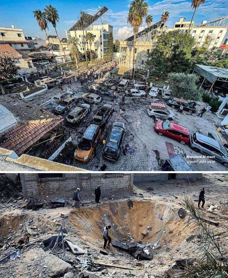 Habertürk’teki o asker kökenli yorumcunun iddiasına göre bomba MK84 idi. Öyle olsa krater daha büyük olurdu. El-Ehli hastanesinde bombanın düştüğü yerde sadece yangın etkisi görülüyor. Bu tür tahribatı sadece roketler yapıyor.