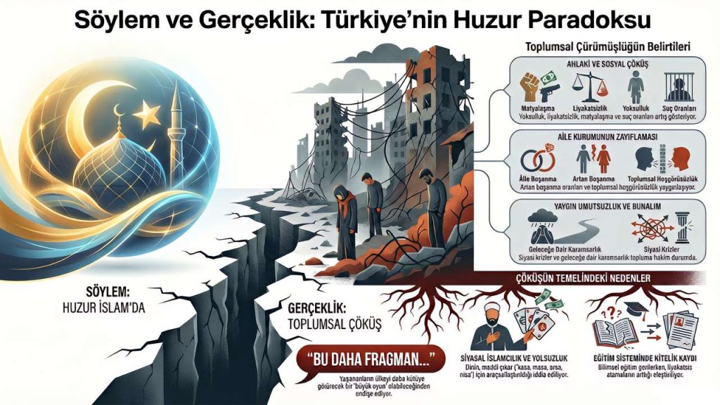 İmam Hatip Liselerinden mezun olanların makamlara getirilmesi, eğitimsizliğin ve akıl dışılığın zirveye tırmanmasıyla paralel ilerliyor. Boşanma oranlarındaki artış, aile kurumunun temelden sarsıldığını gösteriyor. Bağnazlık ve şiddet eğilimi, hoşgörüsüzlüğün tehlikeli boyutlara ulaştığını kanıtlıyor. Siyasi bunalım, orman yangınları, mutsuzluk, umutsuzluk vb çürüyen tablonun tamamlayıcılarıyken “Huzur İslam’da” diyenlerin gözlerini kapattığı gerçeklik.