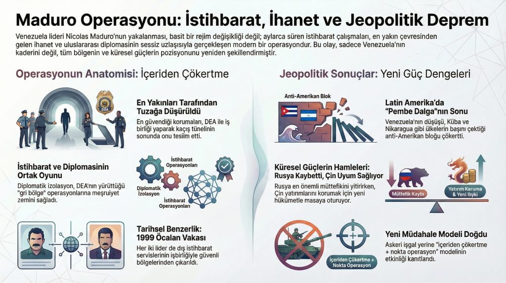 Kaçış tünelinin çıkışında korumaların Maduro’yu bizzat DEA ajanlarına teslim etmesi, istihbarat terminolojisinde “içeriden çökertme” (internal subversion) olarak adlandırılması, otoriter rejimlerin en zayıf noktasının, sadakat üzerine kurulu görünen ancak ekonomik ve siyasi baskılarla kırılan güvenlik bürokrasisi olduğunu kanıtlamıştır. Gelişmeler, iç ihanetin ve istihbaratın manipülatif gücünün birleştiğinde ne kadar yıkıcı olabileceğini göstermektedir.